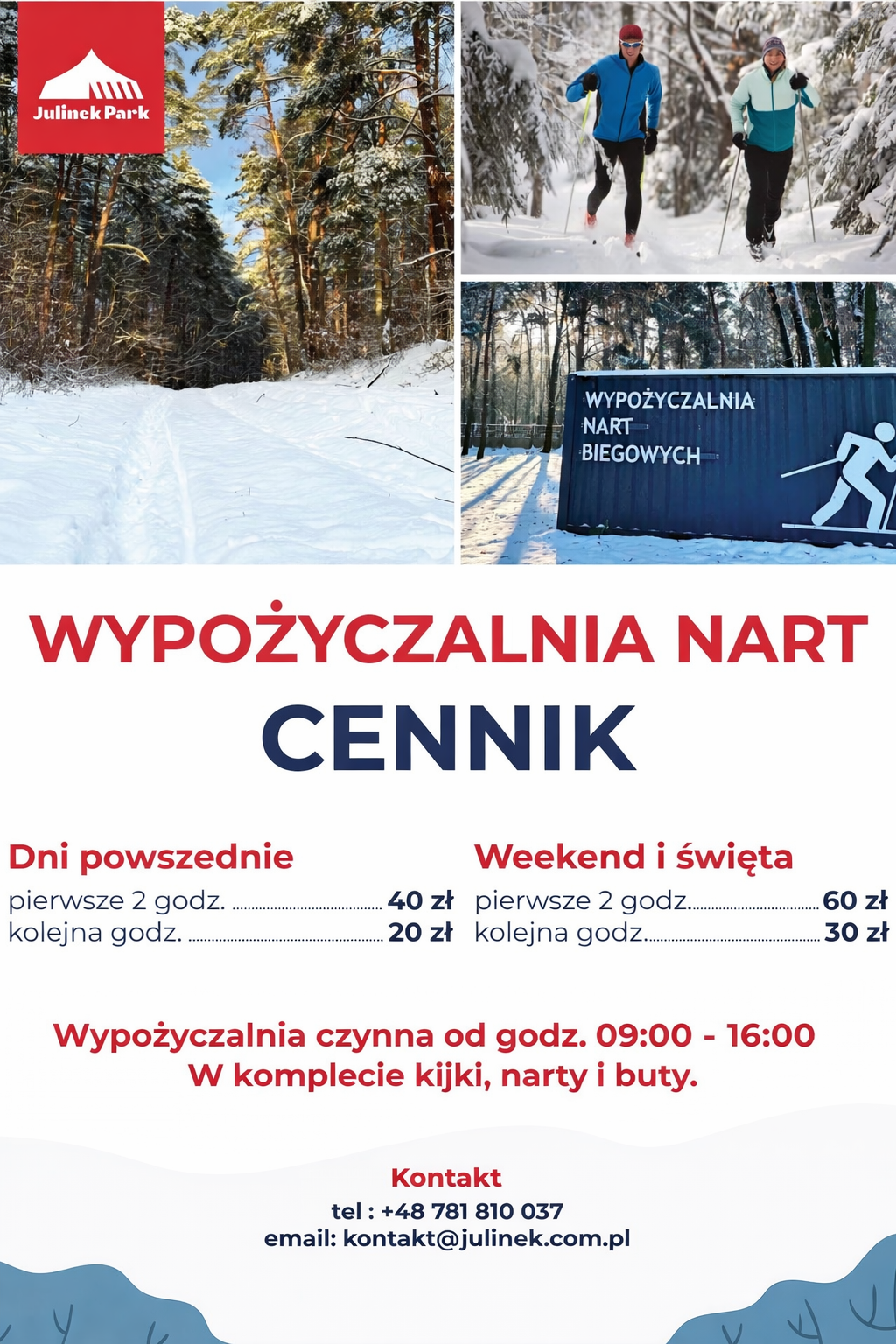 W okresie zimowym na terenie Julinka funkcjonuje wypożyczalnia nart biegowych. Stąd rozpoczyna się wiele tras biegowych po pięknych białych szlakach Puszczy Kampinoskiej. Trasy są zróżnicowane pod względem długości i wzniesień. Zabawa zatem może trwać nawet cały dzień.